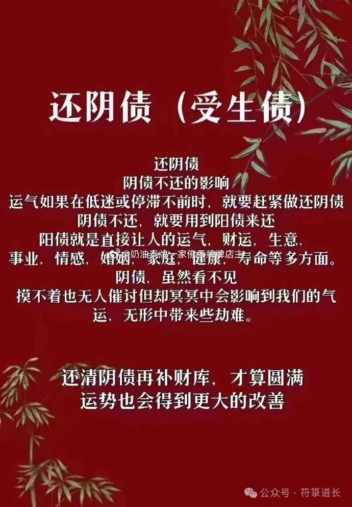 ✦ 受生债 ✦ 一、什么是受生债? 听到受生债,很多人都会觉得神秘。其实,没那么复杂,就是人受胎下生后所欠阴债。 受生债在经书里是这样解释的:每个人转世之前都要到地府曹官那里去借钱,培植自己的福慧资粮,因此每一个人出生后才有粮吃有衣穿有钱花等等福报,因此人生需要还的第一个阴债就是受生债。人们希望早还此债,以消灾解厄,事事顺利。 在道教,讲受生债的经典有很多,比如《太上老君说五斗金章受生经》、《灵宝天尊说禄库受生经》、《太上元始天尊说开库钥匙妙经》等。后世将《太上老君说五斗金章受生经》和“四品经”、《真武经》合称“六品经”。 据《灵宝天尊说禄库受生经》载,十方一切众生,命属天曹,身系地府,当得人身之日,曾于地府所属冥司,借贷禄库受生钱财使用。方以禄簿注生,为人富贵其有贫穷者,为从劫至劫,负欠冥财,夺禄在世穷乏,皆是冥官所克,阳禄填于阴债。 也就是说,众生在地府所属冥司借贷禄库受生钱财注生,如果累欠禄库受生钱财在世就会有各种不顺利,甚至穷乏。 二、何为阴债? 受生债当属阴债中的第一大债务,其重要性远超本世今生的其余阴债,它是你今生投胎前所欠的。而过去的前几世和现在的父母债、吃生债、杀生债、寿生债、流产堕胎债、风流债、天地债、偷情债、官利债、轮回债、历劫冤凶人命债、牢狱债、孽债和一切众生等债统称为阴债。 随着时间的推延及人心的变化,每个人的福德及灾障都在时刻变化中,建议福主们有机缘一定多还受生债。 一则是古今更迭,金银财帛换算法门各有不同,防止因换算不同而导致还债的缺失; 二则更为关键,目前关于其他阴债的偿还法门并不多,这时候就可以用还受生债的法门多次还债,多余的受生债会转换弥补成自身的阴债,其实质也起到了还阴债的作用。 三、人是怎样受生的? 《灵宝天尊说禄库受生经》曰:“昔赐宝树一株,付与酆都北帝,植于冥京,明察众生善恶果报。以圣箭三矢,神弓三张,给与得生人身男女。”将此弓箭望宝树而射: 射得东枝,得官爵长寿身。 射得南枝,得延寿康健身。 射得西枝,得富贵荣华身。 射得北枝,得贫穷困苦身。 上之宝树者,乃是业镜果报之缘。若在生钦敬三宝,方便布施,设斋诵念,行种种善缘,及依吾教,诵念此经,填还禄库受生钱者,得三生常为男子身。若复死亡,不经地狱,再复人身。酆都若以弓箭施于宝树,灵宝天尊以神力扶助,无使中于北枝,再得荣贵之身。 四、为什么要还受生债? “受生债”又为公债,为人受胎下生后所欠地府之阴债。 《太上五斗受生经》原文记载: “当生之先,每以为灵魂在天曹地府都曾许愿。来世当受生人之时需要还本命银钱,即受生债。不许此愿不许受生人间,永在地狱内受苦,生人必还此债,不还者必将遭受短命、病苦、贫穷、牢狱之灾、财运不聚、长生口舌之灾、心不如意、结怨之极。” 翻译成白话文,大致意思就是: 人降临世间之前都会到地府曹官那里去借钱,培植自己的福慧资粮,因此每一个人出生后才有粮食可以吃、有财富可享用等等福报,而欠下的这笔钱就成为受生债。并答应曹官,转世后偿还前世所欠之种种罪孽。 可是人在投胎后,因为忘记了前尘往事,也将自己所欠地府曹官之事亦忘记了。所以天尊大慈悲,颁出《太上老君说五斗金章受生经》以劝诫世人有债当还,填还所有过去现在父母债、吃生债、杀生债、寿生债、流产堕胎债、风流债、天地债、官利债、轮回债、历劫冤凶人命债、牢狱债、孽债、等等一切众生债。这集中体现了道教的因果承负理念,通过天尊经文的开示,有意识的去改善种子,成就善因,最终必得佳果。 让人了却今生前生所欠之阴债,从而减轻罪孽,减少业障,愿得现世安乐,出入平安通达,愿望达成,吉无不利,自有本命星官垂护庇佑,过世之时不失人身,文武星临,财星禄星,五福照耀,身宫胎宫,安乐长寿,不值恶缘等等益处。 五、如何查自己欠多少受生债? 《太上老君说五斗金章受生经》有: 人生下土,命系上天,人之生也,顶天立地,有阴有阳,各有五行正气,各有五斗所管,本命元辰,十二相属,且甲乙生人,东斗注生,丙丁生人,南斗注生,戊己生人,中斗注生,庚辛生人,西斗注生,壬癸生人,北斗注生,注生之时,各禀五行真气,真气混合,结秀成胎,受胎十月。 人之生身,便有十二年值宫分,各有曹典,主掌禄库。十二宫库,各有主局,生人借贷受生钱簿,及得人身,曾许所属元辰钱财,乞注受生禄库之簿,合同冥司之籍。 《太上老君说五斗金章受生经》、《灵宝天尊说禄库受生经》分别就善男信女须要醮送,五斗本命钱财,十二本命,十二库神等受生所属姓名、钱数做了详细记录。 六、还受生债的功德利益,不还债有什么业果? 《太上元始天尊说开库钥匙妙经》有: 元始天尊於太极之先,开皇元年,在玉京山上,论定阴阳,查对生死,忽听幽冥殿上,男啼女悲,哭声哀叫,大帝问曰,何事悲哀,良久不觉,时有妙行真人,上白天尊言,阳间众生,只贪快乐,不想求生人道,曾借冥府库中,受生银钱,买求阳道,得生人身,不肯填还,自老身亡,飱命魂赴幽冥,阴间考较,受生银钱,至由如斯。 《灵宝天尊说禄库受生经》有: 若复有人在世悭贪愚痴,不信经法,负债不还,更相嫉妬,不思善因,惟恶是作,致使罪簿注名,天曹减筭,及负欠冥司受生钱财,在世不还,更相诳妄,死入地狱,万劫万生,畜兽之身,辗转果报。若复得为