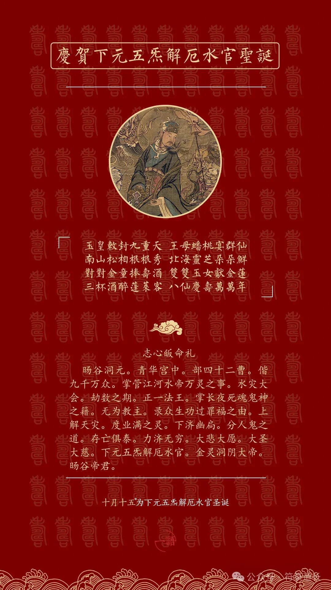 水官诞辰是十月十五日,每逢水官诞辰十月十五日,即来人间,校戒罪福,为人消灾。这天也称为水官解厄日。